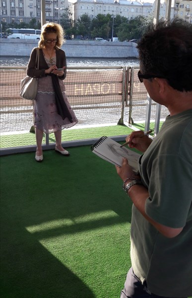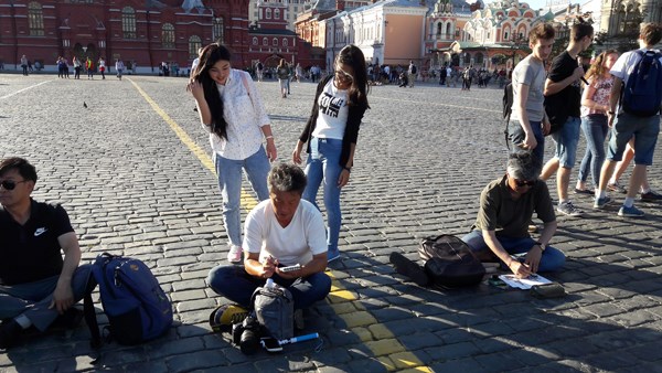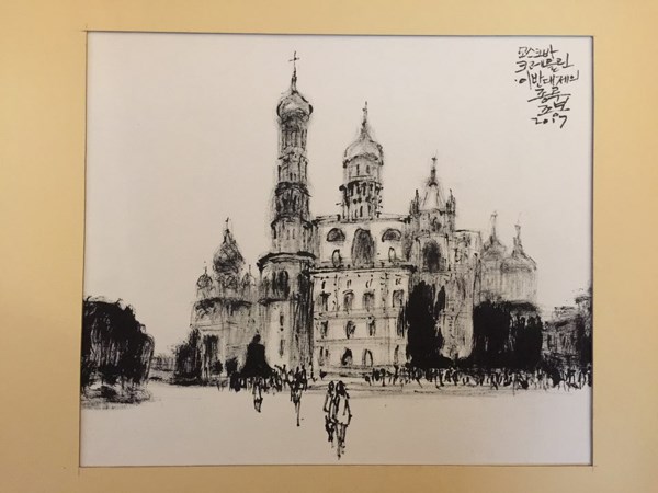 모스크바강 땡볕을 거침없이 거슬러 올라가며 전경을 담고 스케치를 하는데, 강가에서 오늘을 사는 젊은 모스크비치들을 만났다. 앳된 모습에 한국어를 조금 할 줄 아는 모스크바대학생들로 뜨거운 해에 조금은 지쳐 있는 우리에게 꼭 박카스를 준 듯하였다. 스냅 프레임은 강바람에 생기를 품었고 띄엄띄엄 몇 마디와 미소가 오고가며 즐거움을 더하였다. 한국에서 동계올림픽이 열리고 모스크바에선 월드컵 축구가 열린다는 애국심을 서로 발휘하며 아쉬운 이별을 하고 가던 길을 갈 수 밖에 없었다. ㅠㅠㅠ