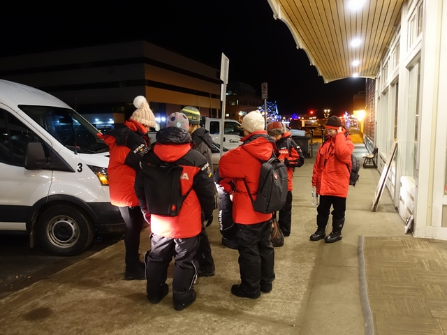 밤이 되면 호텔 앞으로 이렇게 똑같은 복장을 한 사람들이 옹기종이 모여요. 오로라보러 가는거죠!