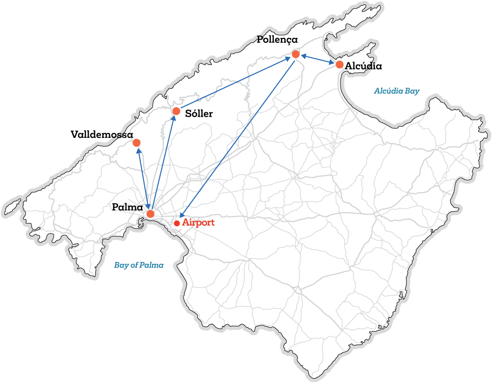 여러 지역을 이동하는 것보다 한 곳에 머무는 여행 선호한다면 교통의 중심지 이자 마요르카 여행의 관문인 팔마에 머물며 대중교통을 이용해 근교 여행을 즐기는 일정을 추천한다. 버스 노선이 주요 관광지를 포함해 섬 곳곳을 촘촘 하게 연결해 뚜벅이 여행자도 얼마든지 마요르카를 탐험할 수 있다. 섬 전역을 버스로 이동하는 게 부담스럽다면 중간중간 택시를 활용하는 것을 추천한다.